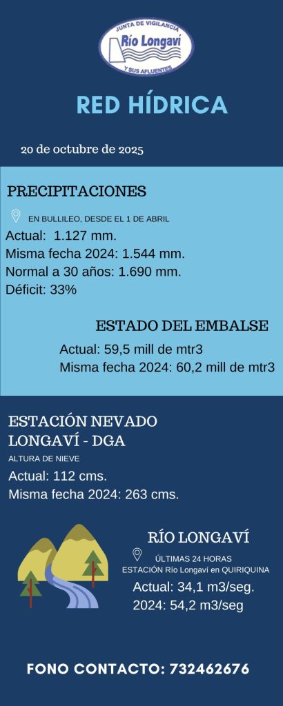 La Junta de Vigilancia del Río Longaví y sus Afluentes, JVRL, informa que la actual temporada presenta un preocupante déficit hídrico superior al 30% en comparación con años anteriores, lo que anticipa una situación compleja para el manejo y distribución del recurso en la cuenca. Según los registros más recientes, el Embalse Bullileo cuenta actualmente con 43 millones de metros cúbicos de agua, de un total de 60 millones posibles. En términos de acumulación de agua, el embalse está con 1.112 milímetros, lo que evidencia la escasez. La situación se agrava aún más al observar los datos de nieve. Este año se han registrado solo 1,56 centímetros, cifra considerablemente inferior a los más de 3 metros acumulados que se observaban a esta misma fecha el año pasado. Esta falta de nieve compromete el deshielo estacional que habitualmente nutre los caudales de primavera y verano.  Llamado a la precaución y al cuidado del agua Ante este escenario, desde la JVRL se hace un llamado urgente a los regantes, usuarios y comunidad en general a extremar los cuidados en el uso del recurso hídrico, proteger los canales y las obras de riego, y mantener una actitud consciente frente a la disponibilidad del agua. "La temporada será especialmente desafiante. Cada gota cuenta, y es fundamental que todos tomemos medidas para preservar este recurso vital", señaló el gerente técnico de la JVRL. Acciones en curso A pesar del complejo panorama, la JVRL continúa impulsando acciones para resguardar la calidad y eficiencia del uso del agua. Por ejemplo, se realiza monitoreo de la calidad de éstas en 50 puntos estratégicos de la red hídrica, lo que permite tomar decisiones informadas y oportunas. Además, se promueven actividades de educación ambiental y sensibilización comunitaria, como el reciente Concurso Escolar de Dibujo “Cuidamos las Aguas”, que convocó a cientos de estudiantes de las comunas de Longaví, Retiro y Parral o la permanente recepción del Museo del agua Bullileo.  Fiestas Patrias: cuidar el entorno es tarea de todos En el marco de las próximas celebraciones de Fiestas Patrias, cuando hay más visita al Embalse o río, la JVRL hace un llamado a respetar y cuidar el entorno natural. "Si vas a disfrutar de la naturaleza, recuerda llevarte tu basura y ayudar a mantener limpio nuestro río y sus alrededores. Cuidar el agua también es proteger el ecosistema que la rodea", enfatizaron desde la organización.