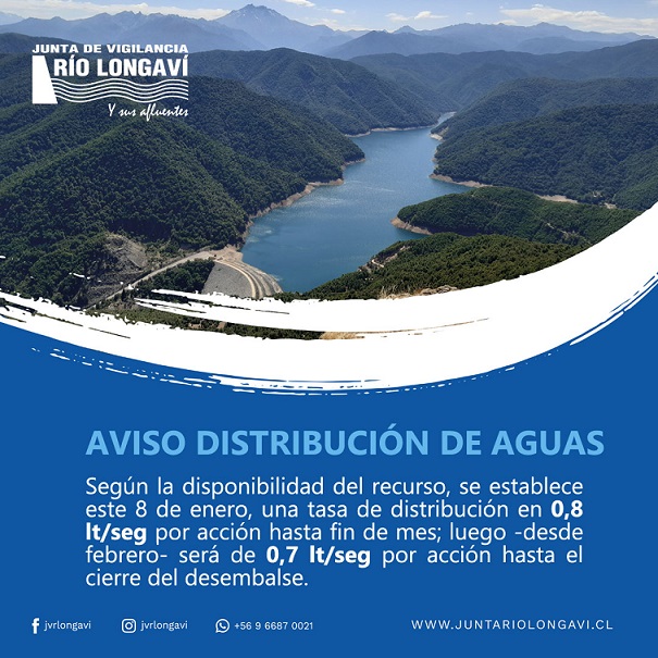 La Junta de Vigilancia del Río Longaví y sus afluentes, JVRL, informó a sus usuarios la definición de la tasa de distribución de aguas para la presente temporada de riego, en función de la disponibilidad real del recurso hídrico en la cuenca.